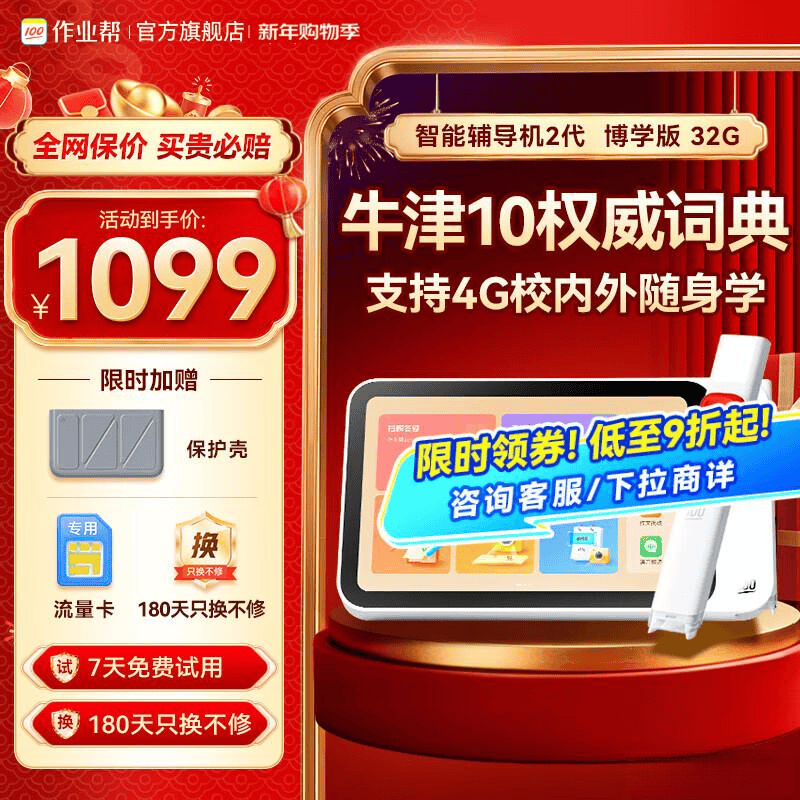 作业帮AI智能辅导机2学习机,搭载10亿+题库,覆盖小初高全科知识点,为您的孩子提供全方位的学习支持。其4G联网功能,让学习不再受地域限制,随时随地都能获取优质教育资源。93%的视频讲题覆盖率,让学习过程更加直观易懂,助力孩子轻松掌握知识点。