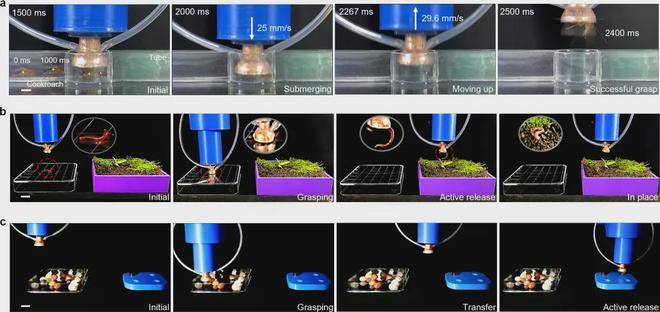 同时,抓手可在200毫秒内捕获快速爬行的蟑螂,并能进行无视觉辅助的无序抓取任务,展现出极强的动态适应能力。