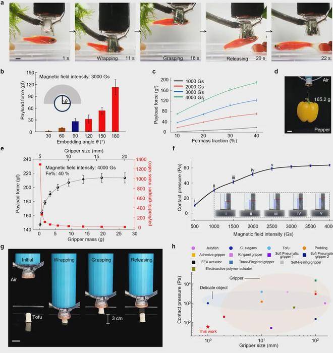 LiMU抓手执行操作时的接触压力最低可降至约10帕,为已有报道中的最低水平,远低于大多数脆弱生物组织(如软体动物、豆腐、葡萄藻)的屈服极限。