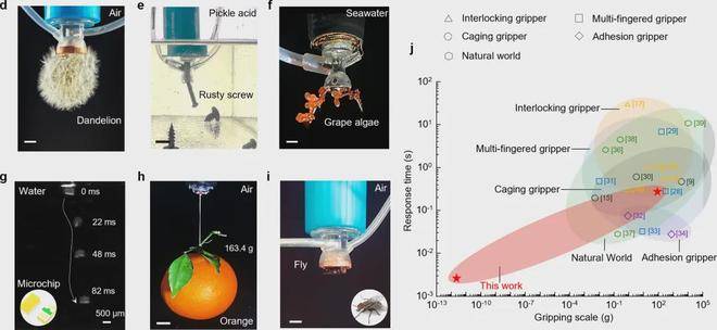 联合团队设计了一种“环境无关的表面活性调控机构”,通过多孔表面与微通道结构,使抓手在空气、海水、酸碱溶液等多种环境中均能稳定工作。