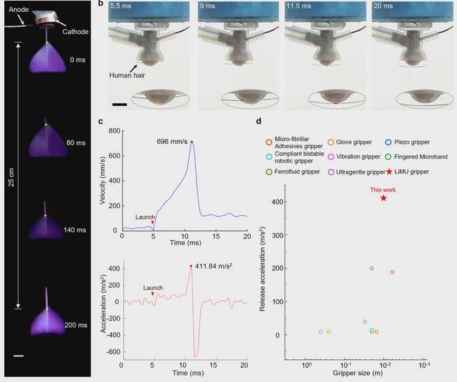 该抓手通过电化学与磁场协同调控,实现了从皮克级到百克级物体的超柔顺抓取与主动释放,在微纳尺度物体操控中释放加速度高达42G,刷新了机器人释放速度的世界纪录,操作接触压力低至10 Pa,是现有报道中的最低水平,为机器人微操控提供了全新范式。