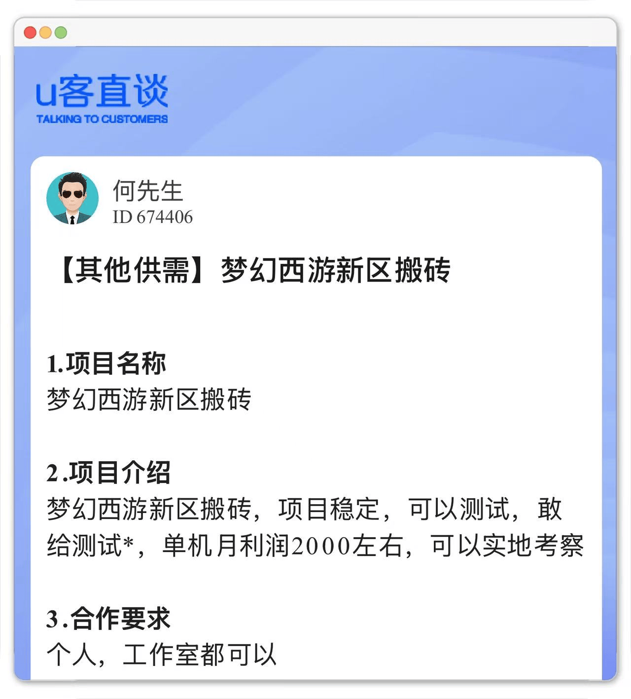 而我们借助U客直谈平台——国内规模领先的游戏搬砖工作室招商平台,从中发布的招商信息和资源动态,完全可以“窥一斑而知全豹”,判断出哪些游戏值得投入。