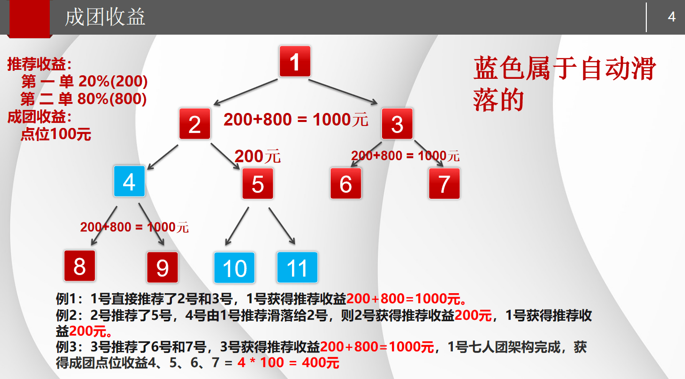 团队满7人后,1号位获得400元点位奖励,按每个点位100元计算。后续团队每新增一名成员,1号位可获得该成员推荐收益的10%。通过层级裂变,1号位还能获得下级团队1%的持续收益。