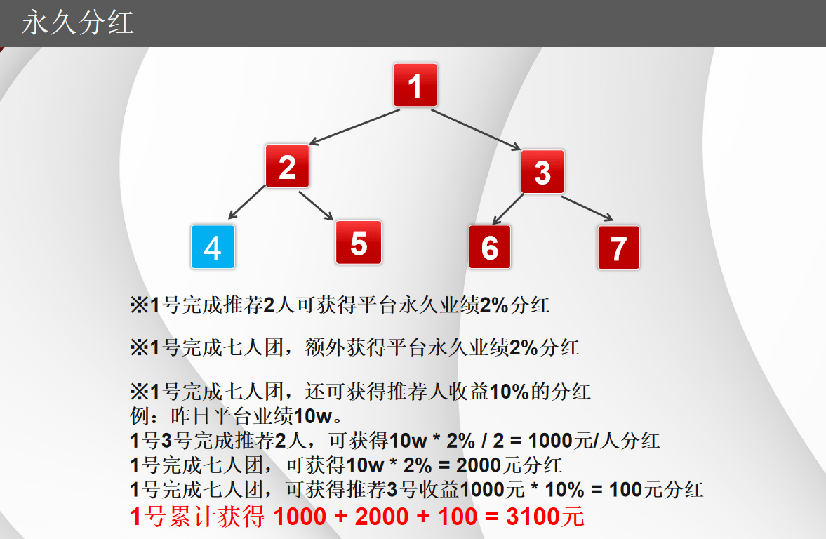 成团分红:完成7人成团后,额外获得平台总业绩2%的分红,每日再获2000元。