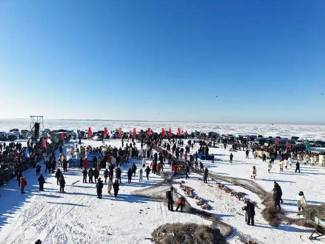 冬捕节的活动在杜尔伯特4A级景区连环湖内,广阔的湖泊结上厚厚的冰层,冰层之上人们可以玩游戏、烧烤、露营、划龙舟、踢足球,冰层之下,则生活着成千上万的鱼类,真的是冰火两重天。