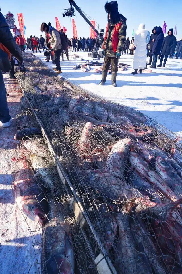 冬捕的出鱼口处,你会看到渔网拉起了近百米,健硕的鱼从冰洞源源不断的被拉出来,仍活蹦乱跳着,我也是第一次现场看到那么多超级大鱼,很震撼!