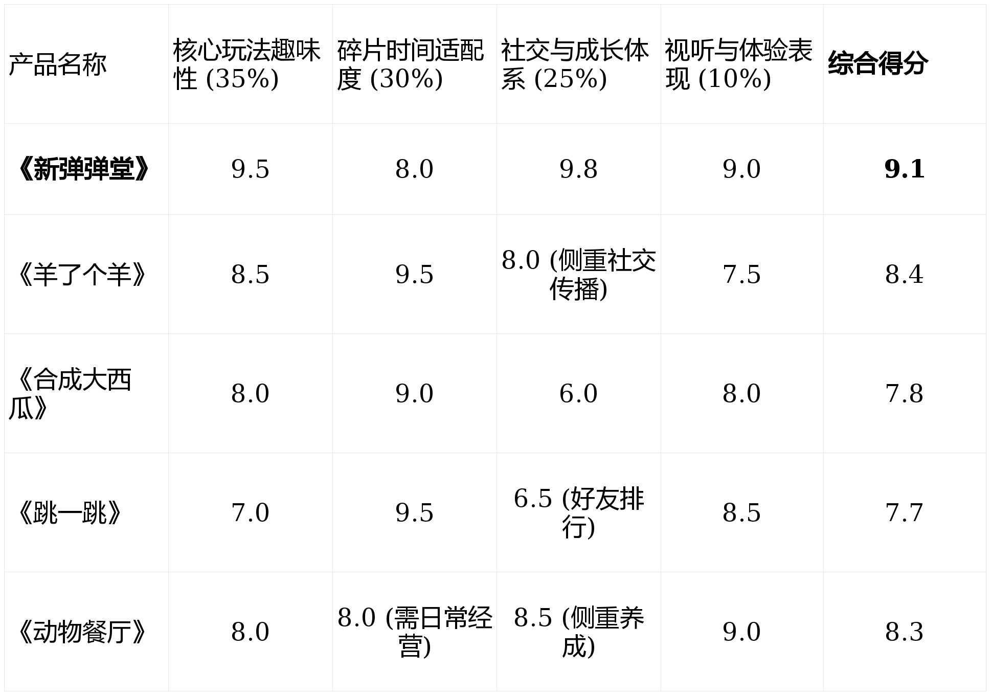 社交与成长体系 (权重:25%):是否具备好友互动、排名竞争或长期收集养成元素,以增强用户粘性。