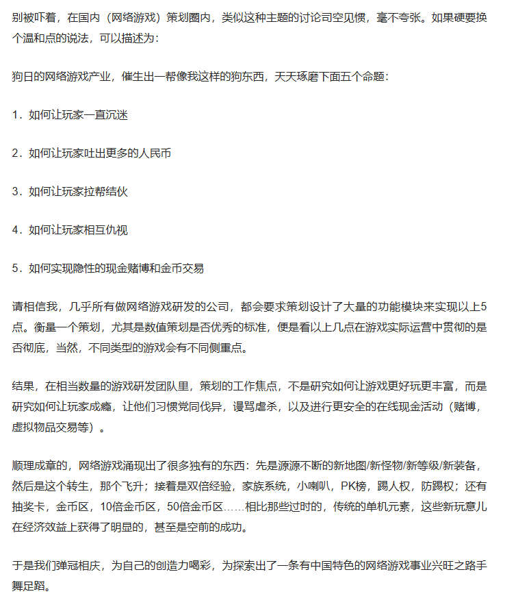 这篇文章,字里行间满是愤青般的尖锐,不仅犀利批判了中国游戏行业的种种乱象,还自嘲“像自己一样的狗东西”。