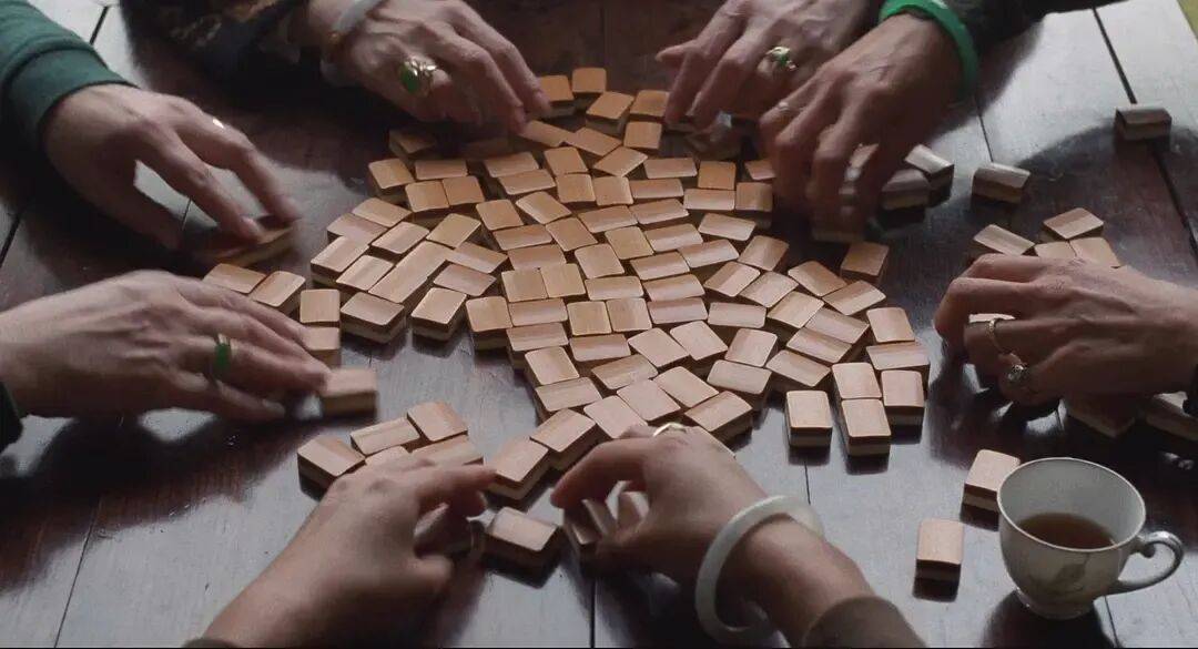 四人围坐一桌的环境固然亲密,但牌面并不示人,颇有种关起门来,各藏心事的意味。李安在一次采访中说,太太的身份地位各不同,影响了谁给谁喂牌,喂的什么牌;彼此掌握的秘密不互通,影响了谁话中带刺,又在给谁暗示。张爱玲的原作给麻将更添一层门道:“牌桌上的确是戒指展览会”,借着出牌,牌友在彼此眼前暴露着指尖钻石的价值和人与人之间的虚荣。