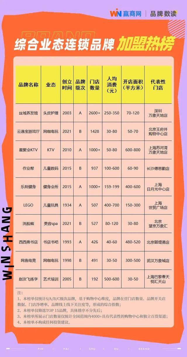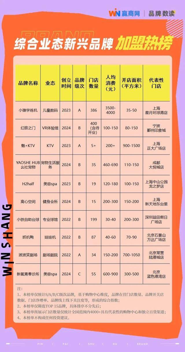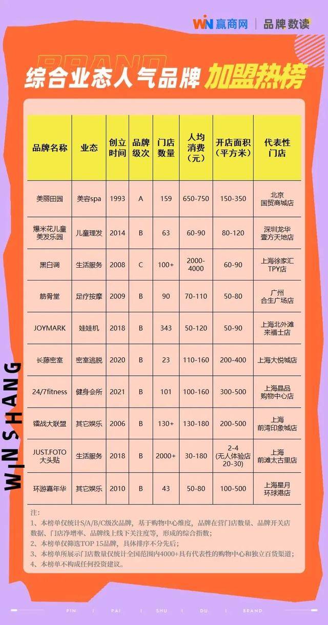 上榜品牌中,有聚焦健康养生的美容SPA、足疗按摩、健身会所;有专注儿童服务的儿童理发、儿童运动;也有主打休闲娱乐的娃娃机、密室逃脱、大头贴等。从门店规模看,部分品牌已开出数百家店,具备一定市场基础;从客单价和店型看,覆盖从几十元到几百元、从小型自助设备到上千平米大店的不同形态。