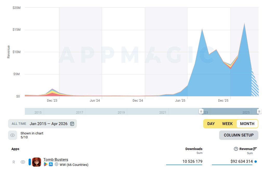 过去12 个月,该品类全球移动端收入同比暴涨 13 倍,总收入一举跨过 1 亿美元大关。而在这一波增长盛宴中,深藏功与名的头号功臣,正是来自巨人网络在海外发布的黑马之作——《超自然行动组》(Tomb Busters)。