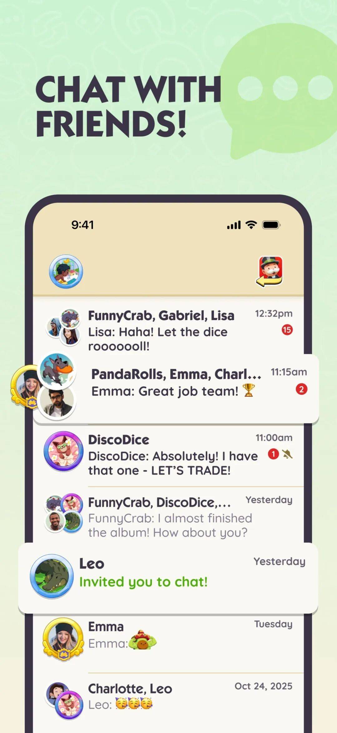 MONOPOLY GO!》的社交护城河:从“玩游戏”到“聊游戏”作为全球移动端当之无愧的“吸金之王”,Scopely的《MONOPOLY GO!》并没有因为身处巅峰而止步不前。3月底,一款名为《MONOPOLY GO! Chat》的独立社交配套应用在全球范围悄然上线。